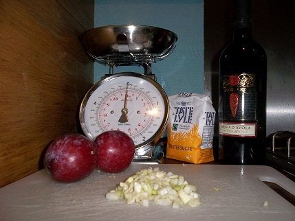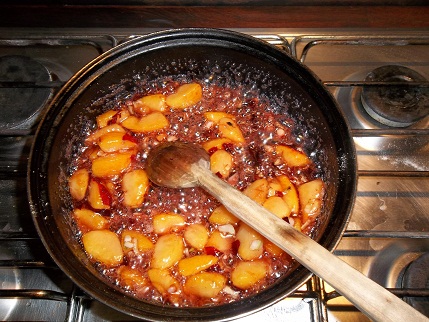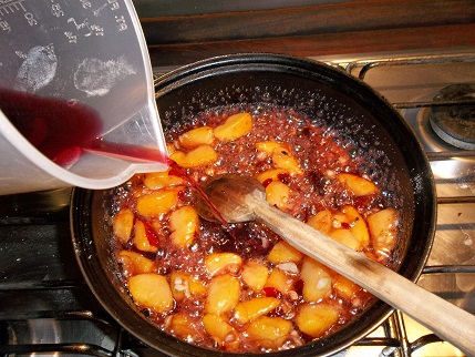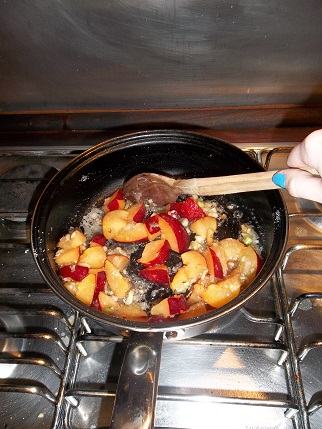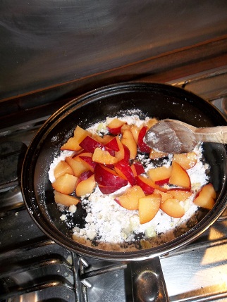 Add the plums to the pan and cook in with the mix until the pieces soften and the sugar is dissolving in the plum juice.