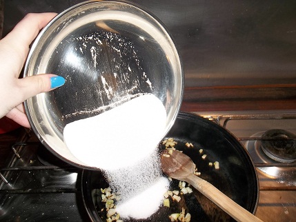 Add the sugar to the mix and stir thoroughly until it has soaked up all of the oil and become crumbly. You don't want the sugar to actually dissolve at this point; just let it form a nice crumble.
