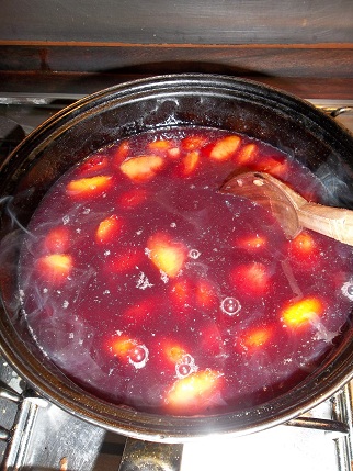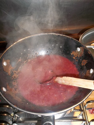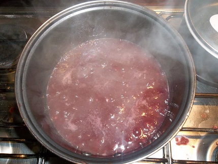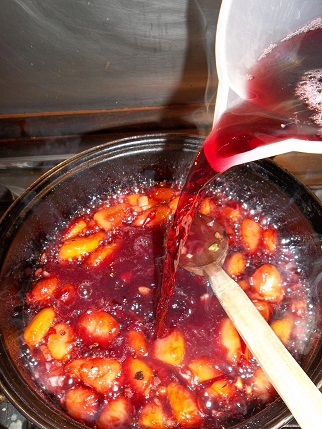 While the mix is still boiling, continue to add the rest of the wine and mix in. Never reduce the heat.