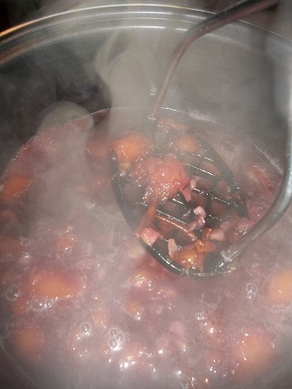 Allow to continue boiling for 10 mins, all the while testing the plum flesh to make sure it's softening. Use a masher to soften the pulp if you think it will help your mixture.